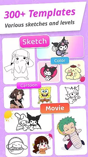 The application includes several advanced features such as video recording, photo capture, and flashlight control during drawing sessions. These tools provide users with greater flexibility in creating and documenting their artwork. Additionally, the app offers a wide selection of free cartoon templates featuring various themes and characters, giving artists plenty of creative options.