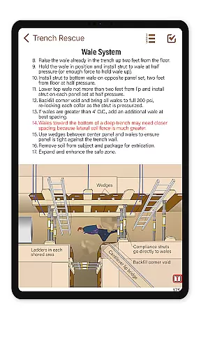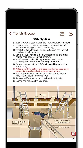 In addition to offering rich multimedia support, the app includes interactive features such as shoring calculators and command checklists. These tools generate practical outputs like cut-lists, which can be shared via text message or email, demonstrating the app's versatility in format handling and commitment to user-centric functionality.