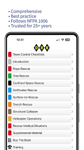 Whether you're training for rope rescue, swift water rescue, or disaster incident command, DRR Rescue ensures consistency, safety, and competency in performing technical rescue skills. Its offline functionality and lack of ads or subscriptions make it a valuable resource in both field and training environments.