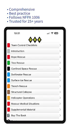 DRR Rescue is a comprehensive technical rescue application designed for rescue professionals. This industry-standard app provides users with complete access to the Essential Technical Rescue Field Operations Guide (FOG), including 240 pages of illustrated procedures, video tutorials, shoring calculators, and interactive checklists.