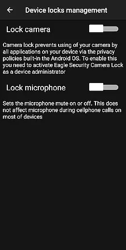 Additionally, EAGLE Security allows users to disable their device's camera and microphone, providing an extra layer of security when needed. This feature is particularly useful in preventing unauthorized surveillance even when the phone is in standby mode.
