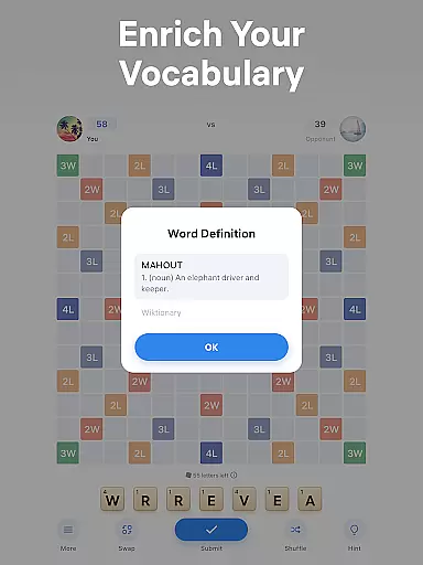 A key innovation is the inclusion of a built-in dictionary providing definitions for every word played. This feature transforms gameplay into an educational experience, allowing users to expand their vocabulary effortlessly. Furthermore, the hint system helps players maximize their scores by suggesting optimal word combinations based on available tiles and board bonuses.