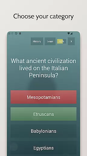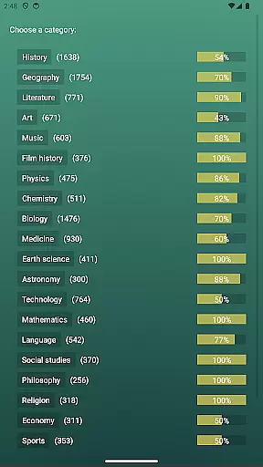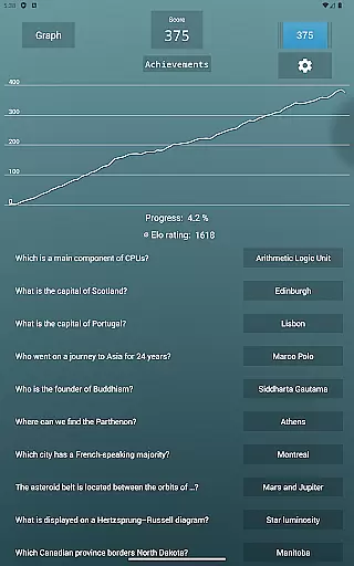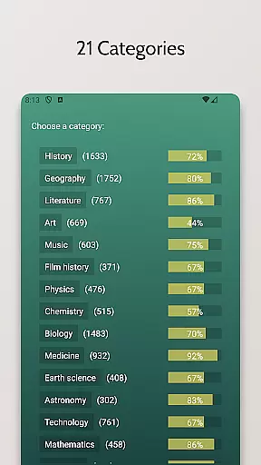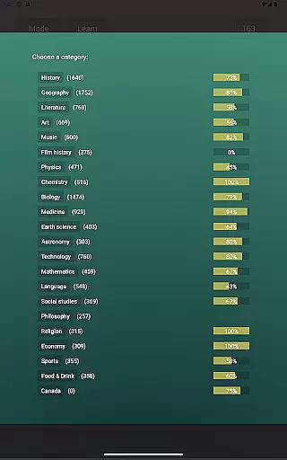 Players can choose from various categories, each offering questions that adapt independently, allowing for personalized learning paths across different knowledge domains. This feature enables users to focus on improving specific areas while maintaining balanced overall progress.