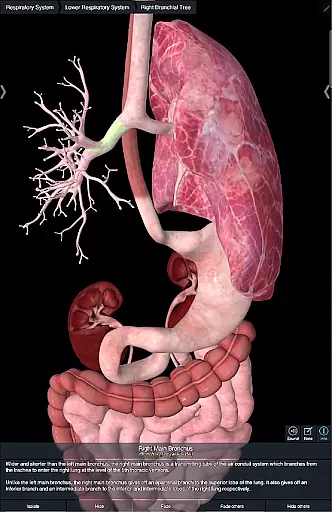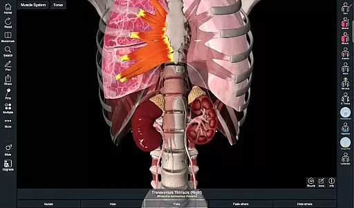 Essential Anatomy 5 stands out with its cutting-edge 3D graphics engine, which renders outstanding quality visuals unmatched by any competitor. The app includes features like Hide/Fade options for individual structures, multiple selection modes, and a slicing tool for detailed exploration of anatomical layers.