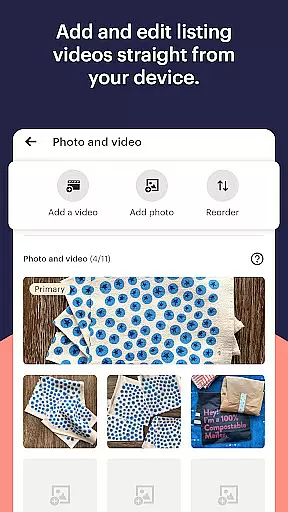 Additionally, Etsy Seller allows users to add and edit listing videos and photos directly from their mobile devices. This feature supports collaboration by ensuring that all team members can update product listings without delay, thus maintaining consistency and accuracy across the shop's offerings.
