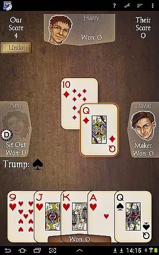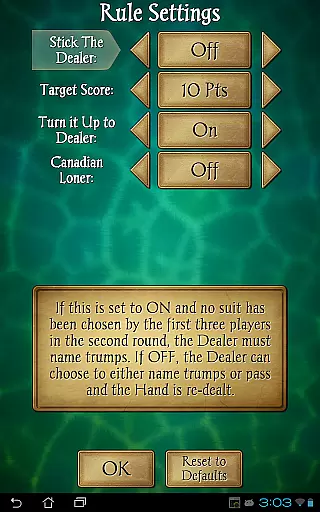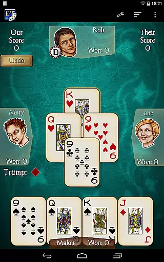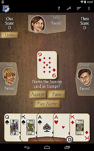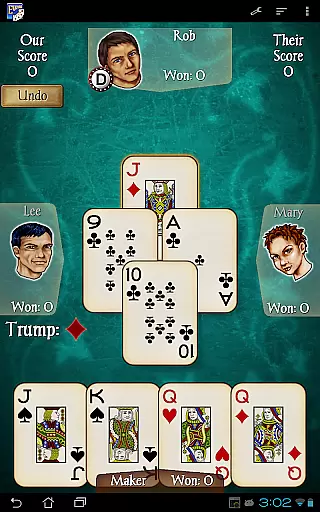 The app's robust feature set extends beyond basic gameplay. Users can maintain detailed statistics for all matches played, utilize helpful tools like undo and hint functions, and even incorporate personal photos as custom backgrounds. With support for both tablets and phones, Euchre Pro maintains consistent performance and visual quality across devices. The inclusion of comprehensive rules and help documentation makes it accessible to new players while still offering challenges for experienced Euchre enthusiasts.