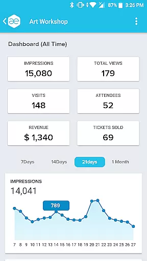 Creating and customizing event tasks is crucial for effective event management. The Event Manager app excels in this area by providing a comprehensive dashboard for each event. This dashboard not only shows the performance graph of an event but also includes metrics such as total views, number of attendees, revenue, and sold tickets over a period of time.
