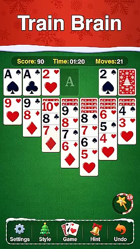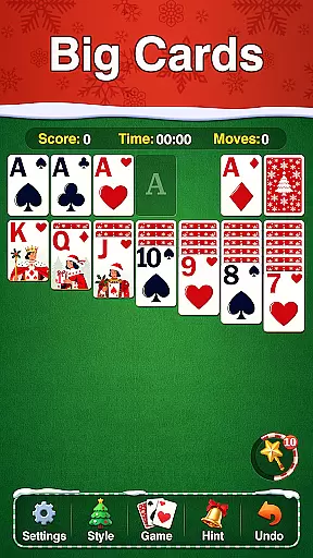 The game offers various modes including drawing 1 or 3 cards, timed or relaxed play styles, and adjustable difficulty levels. A smart magic wand aids in tricky situations, and unlimited hints and undos allow for worry-free gameplay. Additionally, players can personalize their experience with soundscapes, vibrations, and click effects. Winning games unlocks exclusive Christmas themes and tracks progress through stats and best scores.