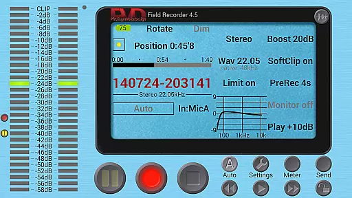 Field Recorder distinguishes itself through a comprehensive suite of professional audio tools. The app's parametric and shelving equalizers, combined with low-cut filters and stereo balance correction, allow users to optimize recordings for any environment. Advanced limiter and soft clipping features prevent distortion even at higher recording levels, ensuring clean audio capture.
