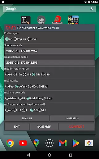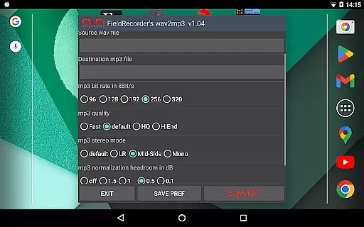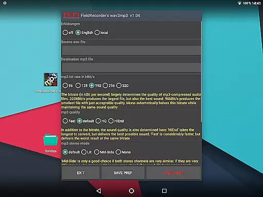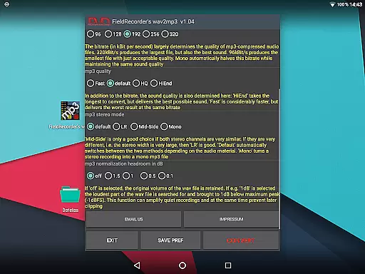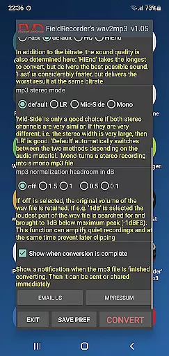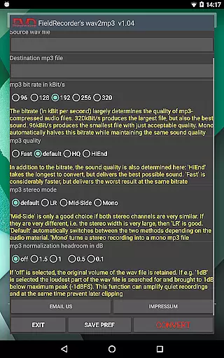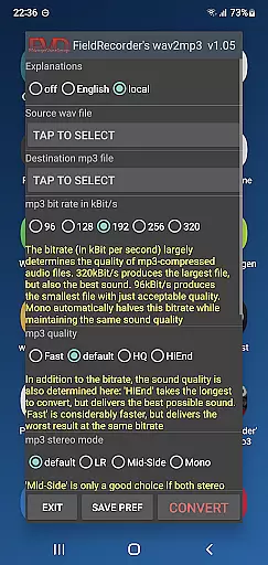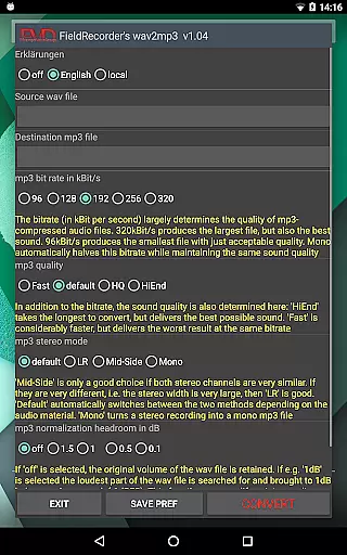 When it comes to audio quality options, FieldRecorder's wav2mp3 provides several customizable settings that allow users to fine-tune their conversions. Options include bitrate selection, complexity settings for the MP3 encoding process, and stereo mode configurations.