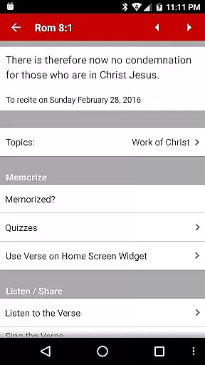 In addition to the extensive quiz options, the app offers several other notable features. Users can access a widget to display verses prominently on their devices, making it easier to incorporate scripture into daily life. The app also includes blog commentary related to the current verse in the schedule, providing deeper insights and context. Furthermore, the availability of spoken verse audio and songs helps users learn verses through auditory means, enhancing the memorization process.