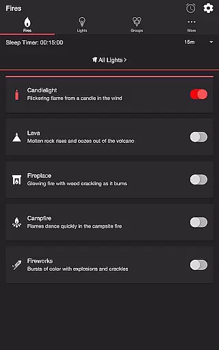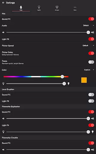Firestorm for Hue stands out with its comprehensive feature set tailored for creating dynamic lighting experiences. The app includes five distinct fire presets - Candlelight, Lava, Fireplace, Campfire, and Fireworks - each offering unique audio-visual effects.