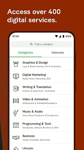 Fiverr is the leading online marketplace for digital freelance services, providing instant access to a global network of remote freelancers. The app connects entrepreneurs with experts across 400+ service categories, including programming, graphic design, digital marketing, and more.