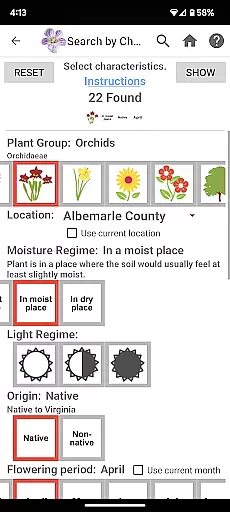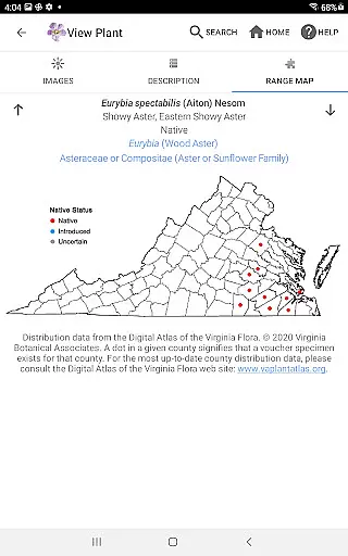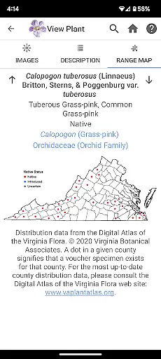 Additional features include original botanical illustrations, a pop-up glossary for technical terms, and detailed range maps showing species distribution across Virginia counties. The app's reference library and botanical help sections provide valuable learning resources, while its offline functionality ensures reliable access to the complete database in remote field locations.