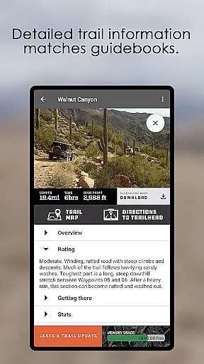 The app offers over 600 popular offroad trails in selected areas, complete with detailed trail descriptions, difficulty ratings, and directions to the start. Each trail is supported by GPS track logs with waypoints, ensuring users can confidently follow the path without getting lost.
