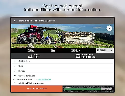 Users can access contact info for current trail conditions, ensuring they are well-prepared for any challenges ahead. This feature enhances safety and preparedness, allowing adventurers to adjust their plans based on real-time updates.