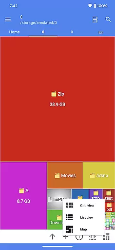 The treemap visualization for storage is another intuitive feature, representing files as colored rectangles. The size of each rectangle corresponds to the file's size, allowing users to quickly identify large files and manage storage space effectively.