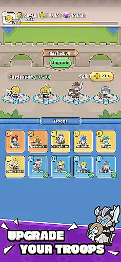The game includes over 10 distinct troop types, such as resilient infantry, long-range archers, shield bearers, and legendary magic knights. Each type boasts unique skills and upgrade paths, enabling players to enhance and evolve their forces. Additionally, the game features more than 100 meticulously designed levels, offering diverse challenges against cunning enemies like goblins, mummies, and yetis.