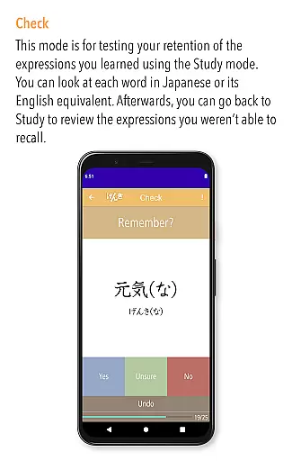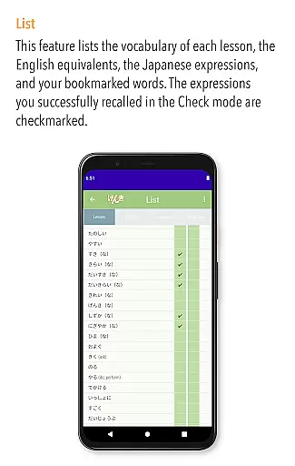 The Check mode is particularly innovative, allowing learners to assess their understanding and categorize words into mastered and unmastered groups. This feature ensures that users can focus their efforts on areas that need improvement. Additionally, the List mode provides flexible organization options, such as lesson order, a-i-u-e-o order, and alphabetical order, making it easy to track progress and review efficiently.