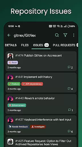 The application supports extensive features including markdown and emoji support, themes, notifications, and self-signed certificate management. Whether you're a developer or a project manager, GitNex provides the tools necessary to streamline your Git repository management directly from your mobile device.