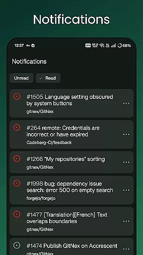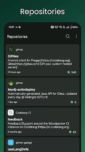The app maintains synchronization with self-signed certificate support, which enhances security while ensuring uninterrupted access to your repositories. Whether you're browsing files, exploring repositories, or checking notifications, GitNex keeps all your data up-to-date across sessions.