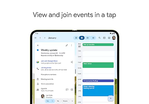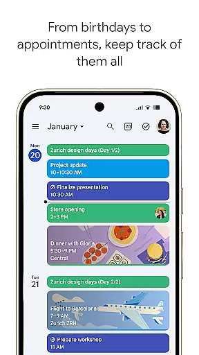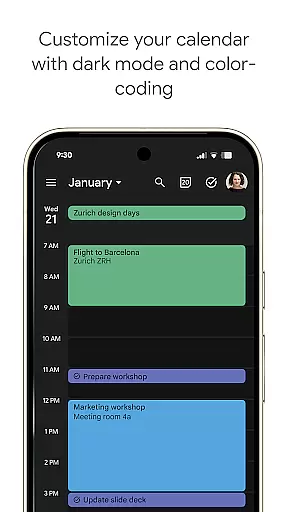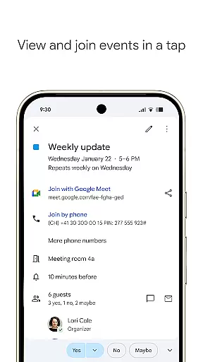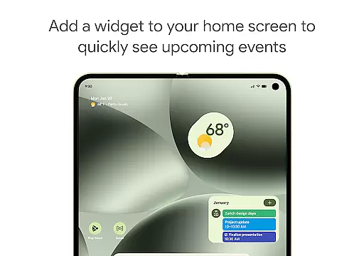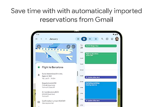 The app automatically adds events from Gmail such as flight, hotel, concert, and restaurant reservations, streamlining your schedule management. It also supports hybrid work environments by integrating Google Meet video calls into calendar events, making remote collaboration seamless.
