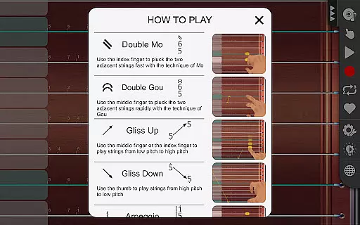 Additional features include a lessons mode for structured learning, interactive music games for skill development, and multi-touch support for complex compositions. Users can also record their performances, explore an extensive library of over 650,000 songs, and utilize automatic tremolo functionality by simply moving their finger horizontally across the strings. The flexible Guzheng view allows easy navigation through drag and pinch gestures, ensuring a seamless user experience.