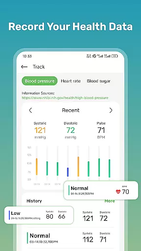Health Sense: Track & Record offers personalized planning by enabling users to track essential metrics such as blood sugar, blood pressure, heart rate, and BMI. The app provides a simple input interface where users can log these metrics anytime and anywhere, ensuring consistent monitoring of their health status.