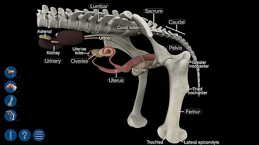 Users can easily navigate through various layers of anatomy by cutting down through the layers or rotating the model to view different angles. The app covers superficial landmarks, muscles, bones, and organs, including specialized models of the hoof, head, and reproductive systems. Additionally, the quiz function offers over 300 structures to test your knowledge, allowing customized quizzes based on individual learning needs.