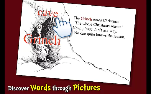 How the Grinch Stole Christmas app stands out with its variety of educational and entertainment features. One of the key highlights is the highlighted narration, which helps improve literacy by visually guiding readers through the text as it is narrated. Additionally, the app includes a feature where children can learn new words by simply tapping on pictures, enhancing vocabulary in an interactive way.