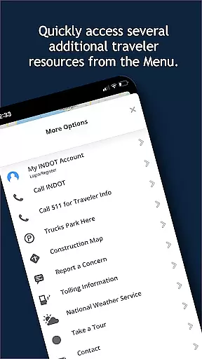 Another notable feature is the integration of GPS functionality, which allows users to track plow locations during winter months and view images captured by these vehicles. Furthermore, the app aggregates data from weather stations statewide, offering insights into potential travel disruptions caused by adverse weather. With additional resources accessible via the 'Menu,' INDOT Trafficwise equips users with everything needed for safe and efficient travel planning.