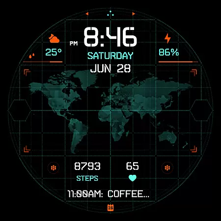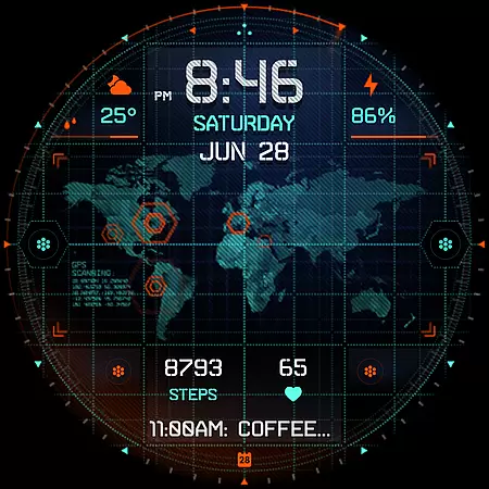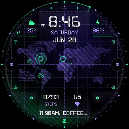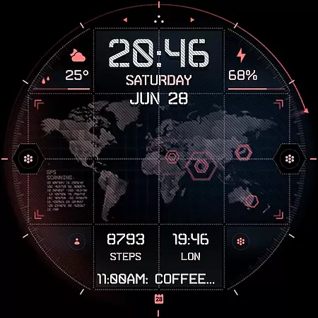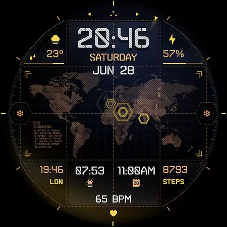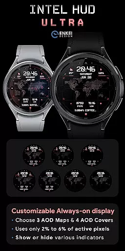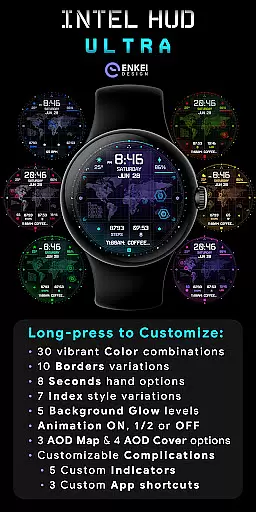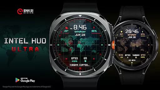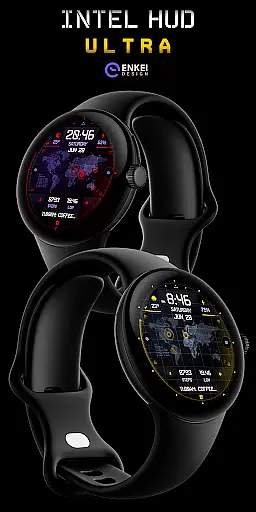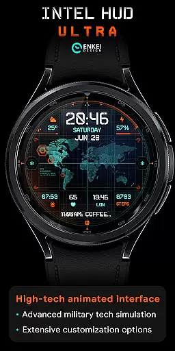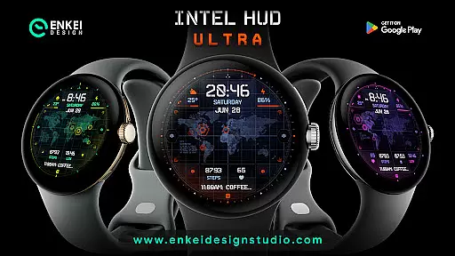INTEL HUD Ultra is a high-tech digital watch face designed for smartwatches running Wear OS 5.0 and newer versions. This advanced watch face combines military-inspired design with cutting-edge technology, offering users an animated interface that's optimized for performance while minimizing battery consumption. The customizable layout allows users to create their ideal style by adjusting indicators, shortcuts, colors, and other visual elements.