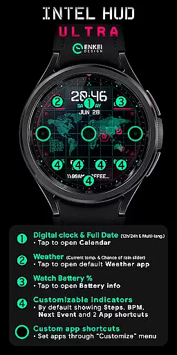 The watch face also includes practical features like step tracking, heart rate monitoring, and next event display. These features are complemented by various tap-to-open functionalities that provide quick access to essential apps. With its combination of aesthetic appeal, performance optimization, and extensive personalization options, INTEL HUD Ultra sets a new standard for smartwatch interfaces.