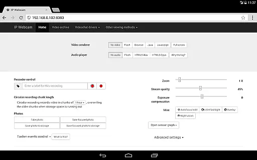 IP Webcam Pro boasts a comprehensive set of features designed to enhance the video monitoring experience. The app supports video uploads to various platforms including Dropbox, SFTP, FTP, and Email via the Filoader plugin. Users can choose from several web renderers like Flash, Javascript, or built-in options to customize their viewing experience.