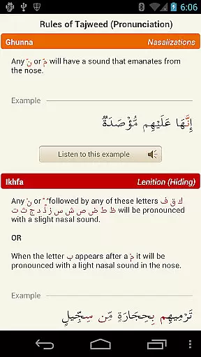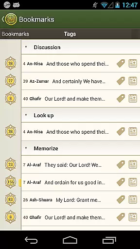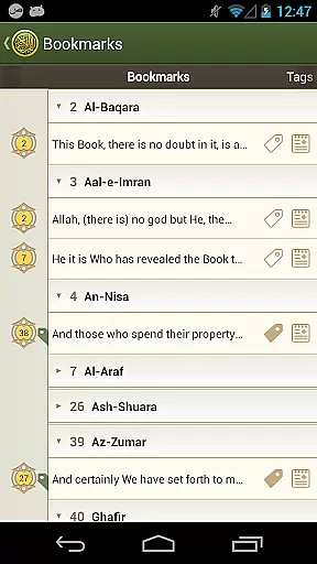 In addition to the Tajweed rules, iQuran offers a zoom-in feature to enlarge the Arabic script, making it easier to read for those with visual impairments. The app also supports full landscape mode, providing a more immersive reading experience. Users can create unlimited bookmarks and tags with notes, allowing them to easily return to important sections or mark areas for further study. The inclusion of several downloadable recitations by renowned reciters such as Sheikh Husary, Mishary Al-Afasy, and Saood & Shuraim adds another layer of depth to the app's functionality.