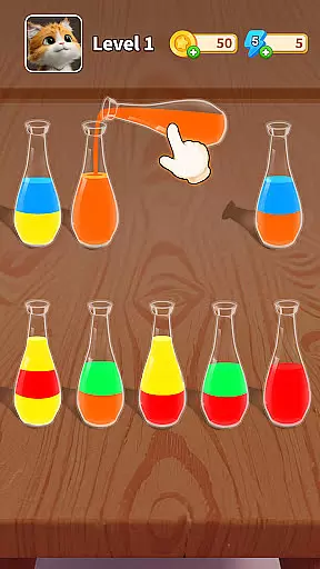 Just Pour! stands out with its unique liquid-sorting gameplay that combines simplicity with increasing difficulty. The app's primary feature is its one-finger control system, allowing players to easily tap and pour water between bottles using minimal effort. This intuitive interface makes the game accessible to users of all ages while maintaining challenging gameplay.