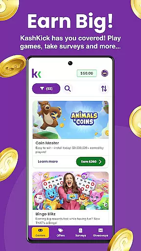 KashKick is a leading lifestyle rewards platform that allows users to earn money through engaging activities like playing games, completing surveys, and exploring exclusive deals. With over 2 million active members, it offers a straightforward path to earning without hidden catches or complicated rules. The app provides multiple earning avenues including popular games, paid surveys, brand deals, and daily giveaways, making it versatile for different user preferences.
