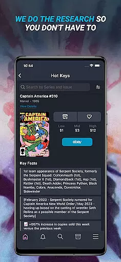 Key Collector Comics distinguishes itself through its specialized focus on key issues while maintaining a comprehensive database of comic books. The app's signature feature is its ability to instantly identify and catalog crucial comic books through an innovative cover image search function, allowing users to quickly recognize valuable issues within any collection.