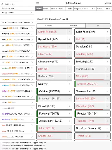 Kittens Game stands out with its rich feature set tailored for strategy enthusiasts. The game includes over 30 distinct buildings, each serving a unique purpose in your kitten village's economy. With more than 50 resources to manage, players must strategize efficiently to ensure sustainable growth.
