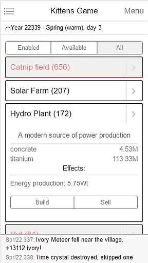 Strategic depth in a game refers to the variety and intricacy of choices available to players, allowing them to devise complex strategies. Kittens Game offers an extensive strategic experience through its simulation of a kitten village where you must manage over 30 different buildings and more than 50 resources.