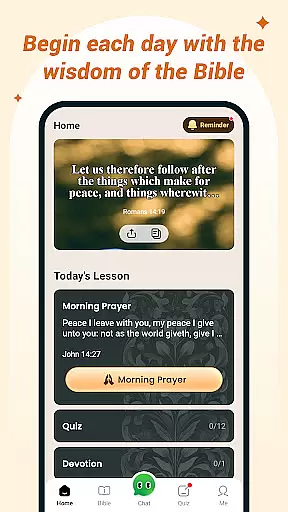 Key features include AI Chat for biblical guidance, a Notes section for recording reflections, and Daily Devotions to apply Scripture to everyday life. The app also includes audio readings, prayer tracking, and quizzes to reinforce learning. With its clean design and thoughtful functionality, this app serves as an essential resource for anyone seeking to strengthen their faith journey.