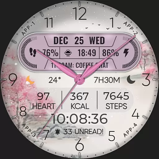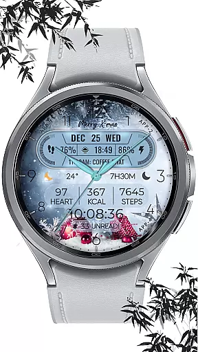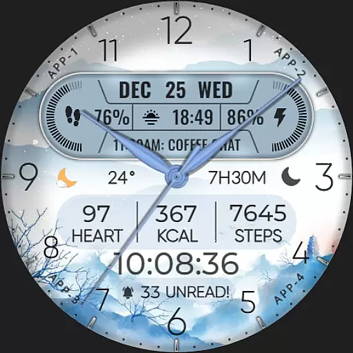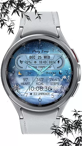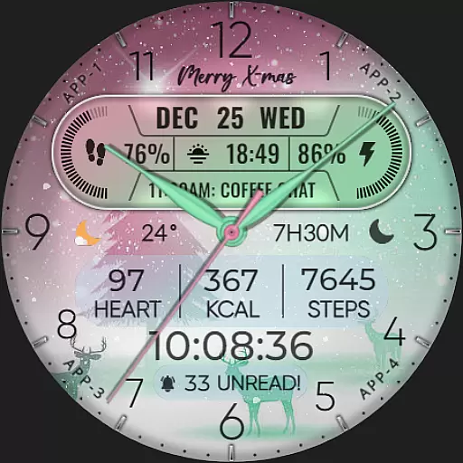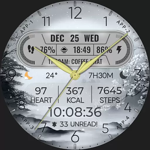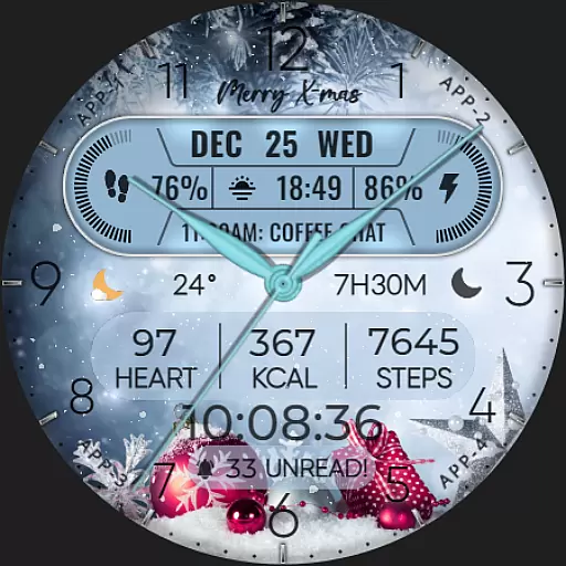 The app supports hybrid styles and includes features such as displaying the date, day of the week, and month. With 8 editable complications, users can choose from a variety of data points including steps count, heart rate, battery level, next event, unread messages, sunrise & sunset times, and calories burned. Additionally, it offers 10 colors and 10 styles to match personal preferences, along with a festive snow falling animation for the X-max season.