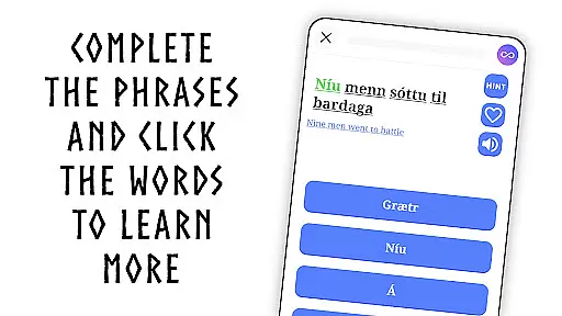 Learn Old Norse+ is an educational application designed to simplify the process of learning the ancient Viking language, also known as Old Norse. This app offers a comprehensive approach to language acquisition through various engaging methods. Users can fill in missing words within context-driven sentences or listen to text being read aloud and select the correct word to complete phrases. Additionally, the app features an integrated Old Norse Dictionary with search capabilities, making it a valuable resource for both casual learners and expert linguists.