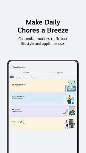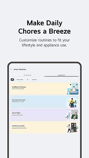LG ThinQ distinguishes itself through innovative features designed to optimize smart home management. The Home tab provides centralized control of all connected appliances, while the ThinQ Play section enables users to download apps and upgrade their devices' capabilities. The app's Smart Routines functionality allows for sophisticated automation, triggering multiple devices based on predefined conditions or schedules.
