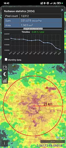 The app's standout feature is its ability to help users plan the perfect dark-sky trip or astrophotography session. With detailed overlays, various mapping tools, and MPSAS (magnitude per square arc second) estimation, users can easily find ideal locations for their activities. The inclusion of historical VIIRS data also enables tracking changes in light pollution over time, making it invaluable for both hobbyists and professionals.