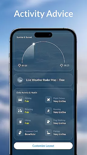 The app stands out with its activity recommendations, which suggest suitable activities based on current weather conditions. This feature adds a personalized touch, making it more than just a weather app but a guide for optimizing your day-to-day life depending on the weather.