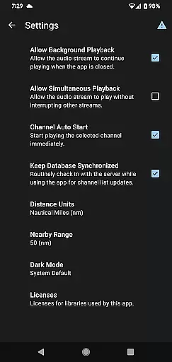 Another notable feature is the 'Nearby' function, which uses location services to identify airports close to the user. This enhances accessibility and convenience, especially for those new to the area or traveling frequently. Additionally, the Favorites list allows users to bookmark preferred channels, streamlining the listening process and saving time when revisiting frequently listened-to feeds.