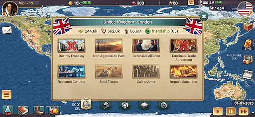 Military development is equally robust, allowing you to train troops, build defense systems, and execute strategic combat operations. Diplomacy adds another layer, enabling you to form alliances, participate in UN votes, and impose sanctions. These multifaceted interactions create a dynamic world where every decision impacts your path to victory.