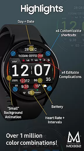 Personalization extends to visual preferences where you can adjust colors of various interface elements. This ensures that not only does the watch face serve functional needs but also matches your style. Despite some features potentially being unavailable on certain watches, MD332 strives to deliver a versatile wearable experience by integrating seamlessly into daily life while offering tools for enhanced productivity and connectivity.