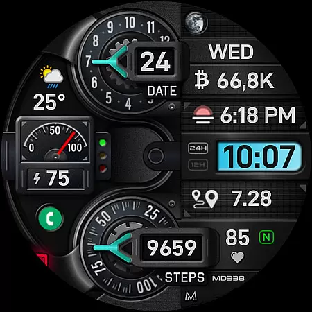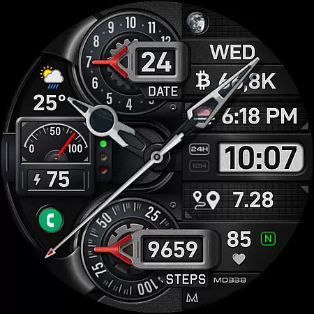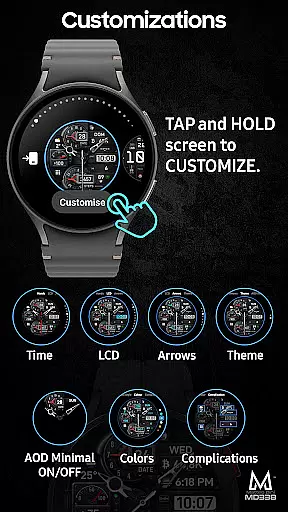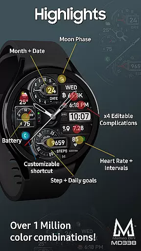 The design is highly adaptable, offering up to 1 million color combinations and various display modes including Always On Display. Users can personalize their watch faces directly on their device by tapping and holding the screen, then selecting 'customize'. With its hybrid design and compatibility across Samsung Galaxy Watch models and Pixel Watches, MD338 ensures both functionality and style.